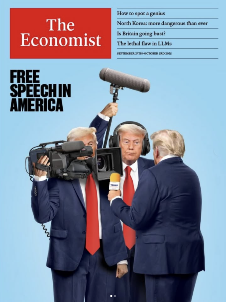 Donald Trump ne veut plus seulement être écouté, mais vénéré. Pour sa couverture, The Economist a retenu une image simple et percutante : Trump tentant d’intimider les médias.